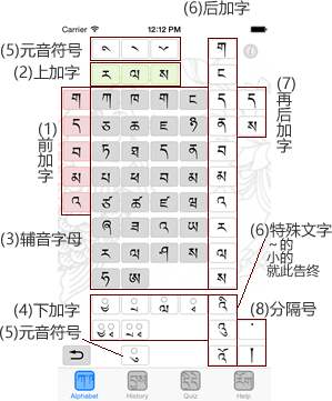 按照藏文音节拼读规则,依序点击设有背景色的图标,可以实现拼读过程及拼合音节的发音。藏文音节拼读规则请参看后续说明。