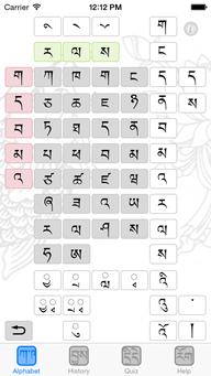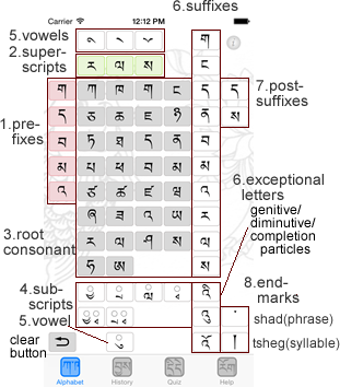The Alphabet screen displays the template of a Tibetan syllable. The 30 root consonants are placed at the center. The vowels and superscripts are placed above while the subscripts are placed below the root consonants. The root letter is one of the thirty root consonant (letter) either alone or with one of the vowels or modified letters such as superscripts, subscripts. The prefixes are placed on the left while the suffixes and post-suffixes are placed on the right of the root letters.