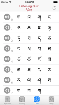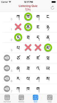 This Quiz screen is to test your ability to correctly identify by sound of the different Tibetan letters. Listen to the sound by tapping the Utterance button in the left and tap the letter that you think is correct. If you are correct, the green circle will appear and if you are wrong the red x cross will appear.
